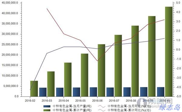2016年10月十種有色金屬產(chǎn)量455萬噸,當(dāng)月同比增長(zhǎng)3.2%;1-10月累計(jì)產(chǎn)量4319萬噸,累計(jì)同比增長(zhǎng)1.2%。