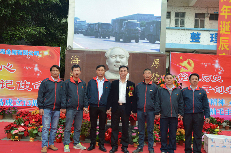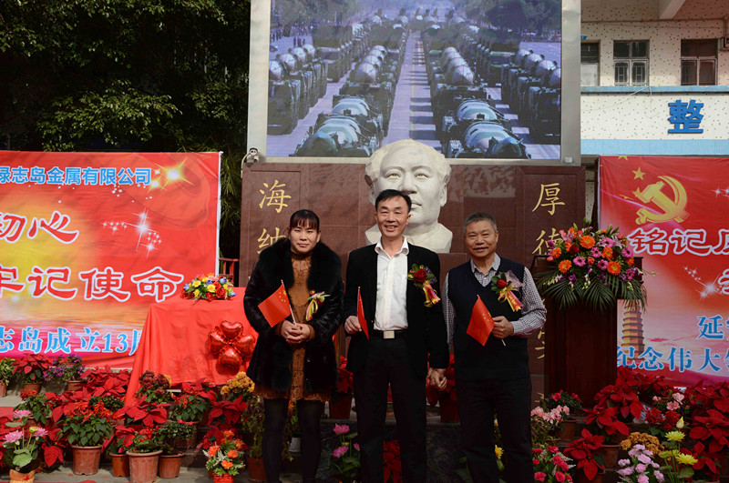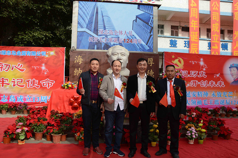 綠志島實業(yè)由來自湖南的朱祖生先生創(chuàng)業(yè)于2000年,由最初的錫渣冶煉廠經(jīng)過十來年的艱苦奮斗,現(xiàn)在公司產(chǎn)品包括焊錫條、焊錫絲、焊錫膏,助焊劑,清洗劑,防銹劑,潤滑油等。綠志島實業(yè)的發(fā)展,在以毛主席思想為信仰的指引下突飛猛進,在“吃水不忘挖井人”的感恩心下穩(wěn)步發(fā)展。為了鞏固毛主席思想作為綠志島的信仰核心,綠志島于2012年12月26日從泰山迎接來毛主席泰山石像,并立于公司內(nèi)部。自此,綠志島每年12月26日都會齊聚眾多認同毛主席的朋友,在綠志島內(nèi)緬懷紀(jì)念毛主席。2017年是綠志島舉辦毛主席誕辰第六年,為此和志同道合的朋友們齊聚一堂,共慶毛主席誕辰。