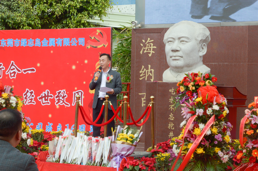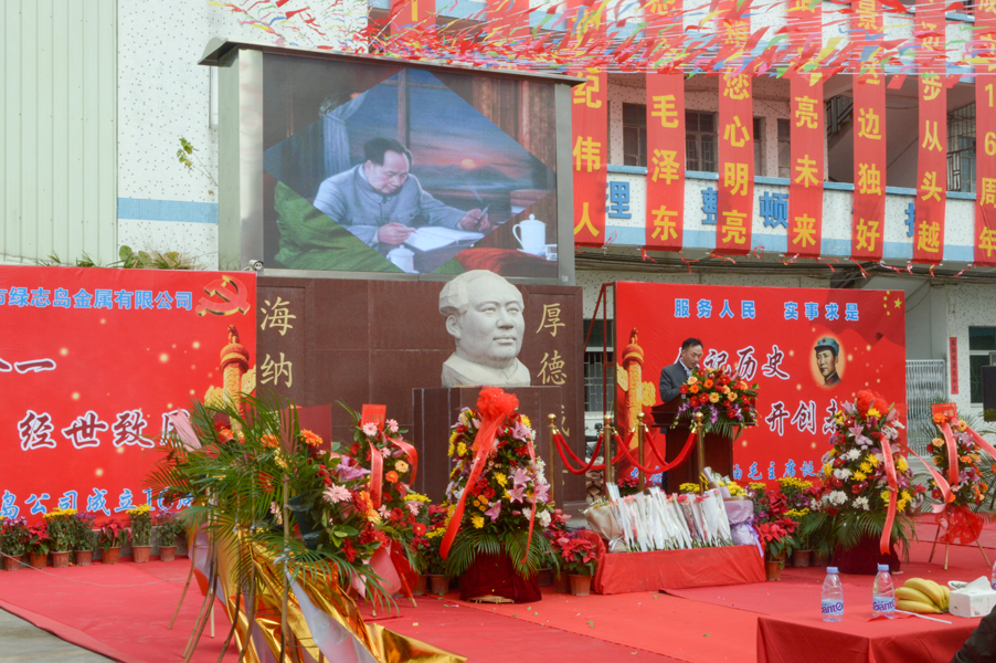 綠志島實業(yè)由朱祖生先生創(chuàng)業(yè)于2001年,經(jīng)過多年的發(fā)展奮斗,現(xiàn)在公司產(chǎn)品包括焊錫條、焊錫絲、焊錫膏,清洗劑,防銹劑,潤滑油等。綠志島實業(yè)的發(fā)展,在以毛主席思想為信仰的指引下突飛猛進,在“吃水不忘挖井人”的感恩心下穩(wěn)步發(fā)展。為了鞏固毛主席思想作為綠志島的信仰核心,綠志島于2012年12月25日從泰山迎接來毛主席泰山石像,并立于公司內(nèi)部。自此,綠志島每年12月26日都會齊聚眾多認(rèn)同毛主席的追隨者,在綠志島內(nèi)緬懷紀(jì)念偉大領(lǐng)袖毛主席。
